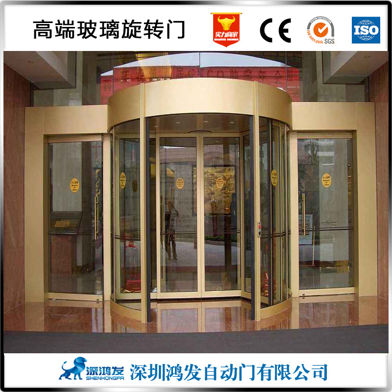 弧形玻璃旋转门分为固定部分和旋转部分,均由铝型材框架和玻璃等组成。立柱、曲壁、门扉一般采用高强度铝合金型材,结构简洁,精密牢固。采用中心门轴结构安装和驱动旋转门体设计,每扉门三面安装密封毛条与地面天花及曲壁紧密接触,使门扉在任何位置均处于密闭状态;门扉玻璃采用(3+3)夹胶玻璃或6mm厚钢化玻璃,曲壁玻璃一般采用(4+4)夹胶玻璃,安全可靠。