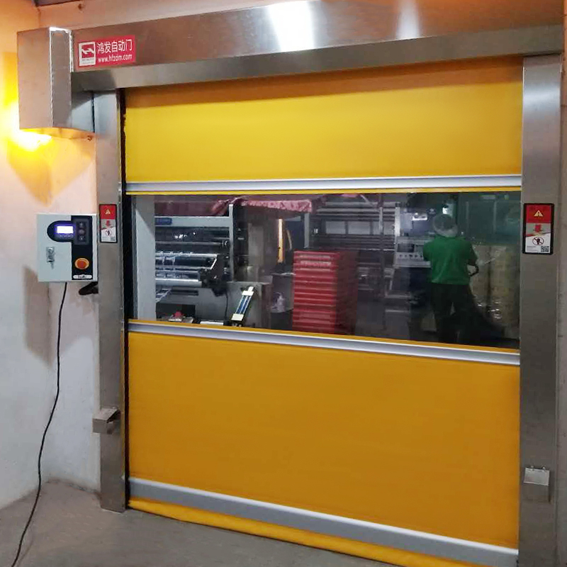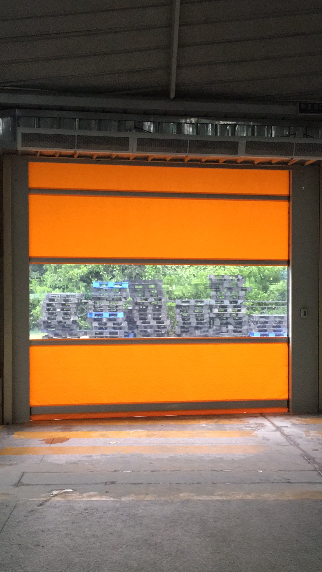 自动快速门帘布颜色:黄色、白色、蓝色、红色、灰色或全透明等,中间加透明窗。